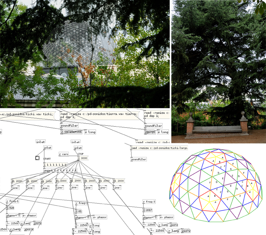 English version: Situación de bóveda (Vault’s Situation) is an outdoor site-specific sound installation created for the gardens of the historical institution of the Spanish culture, Residencia de Estudiantes (Madrid), on the occasion of its 100th anniversary. The piece is installed in a hundred-year-old pine tree that describes with its branches a vast vault, in which it is visually inscribed the immense architectonical vault of a close old building. Vault’s Situation takes two samples as a starting point to the piece that is real time processed in an octophonic sound system. The difference in the frequency of each created sound produces a sense of movement in the inner space of the vault. The sound installation could be described as a design of the experienced spatial forms and the visual images captured in a specific three-dimensional space.