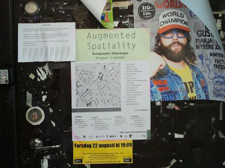 Augmented spatiality was a public art project for the suburb of Hökarängen in Stockholm in which the artworks, performances and other comprised events were integrated into the social and spatial processes taking place in the public sphere.