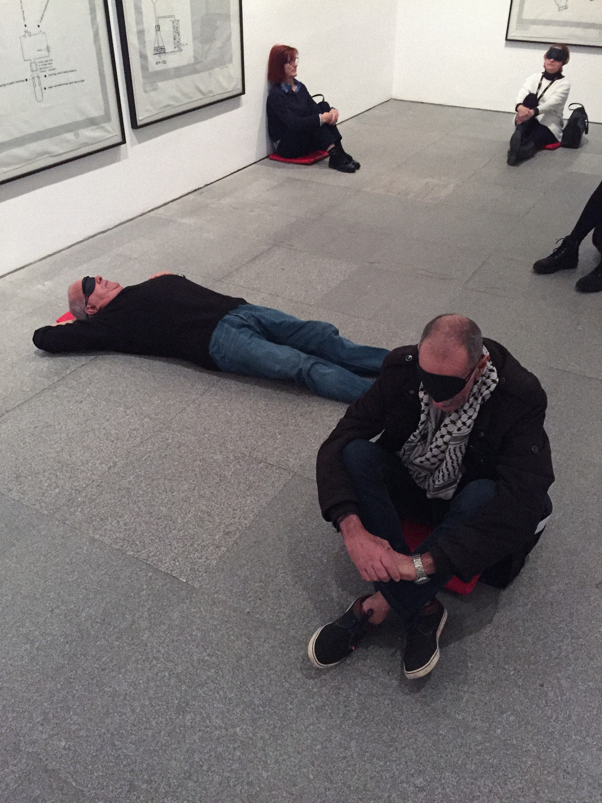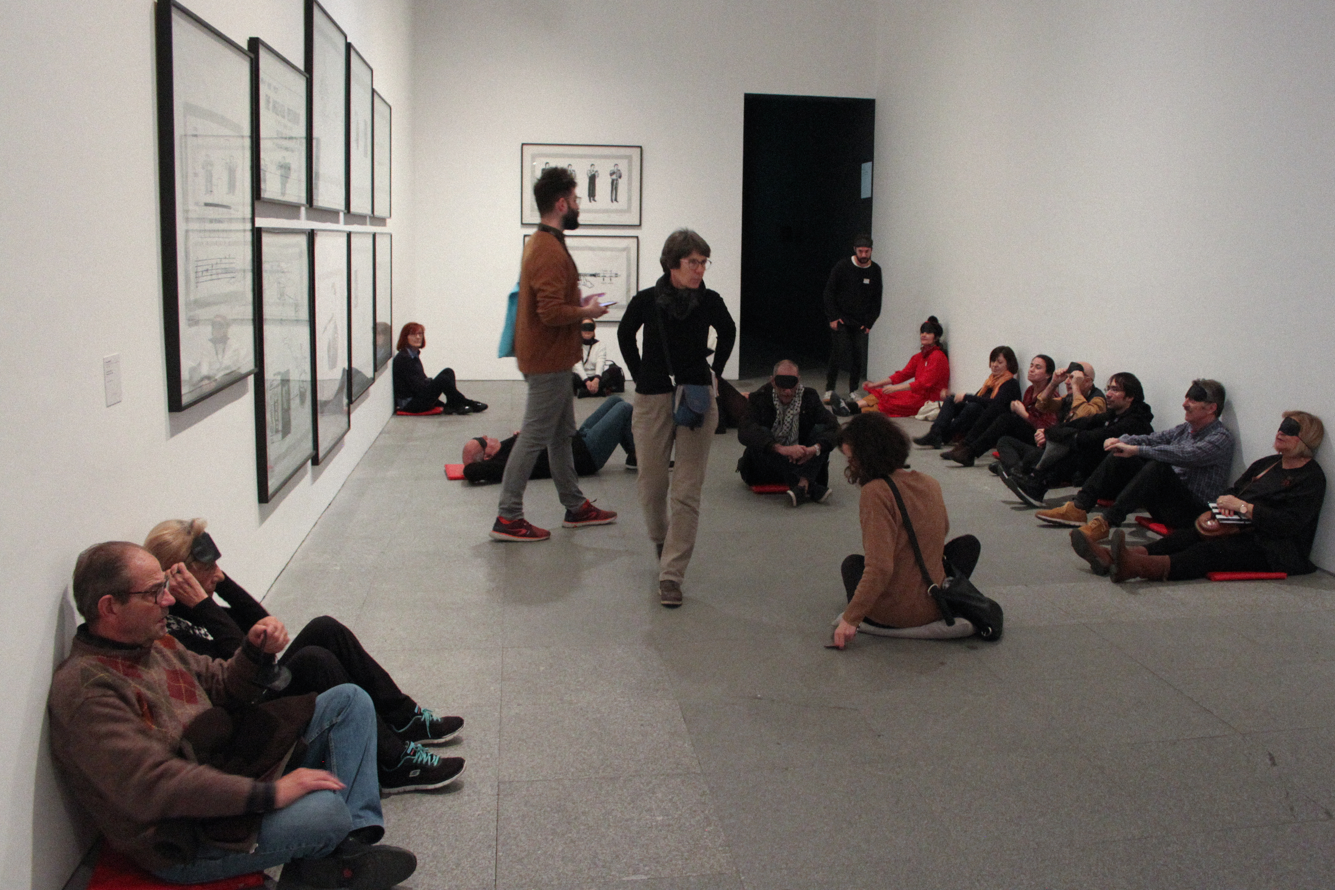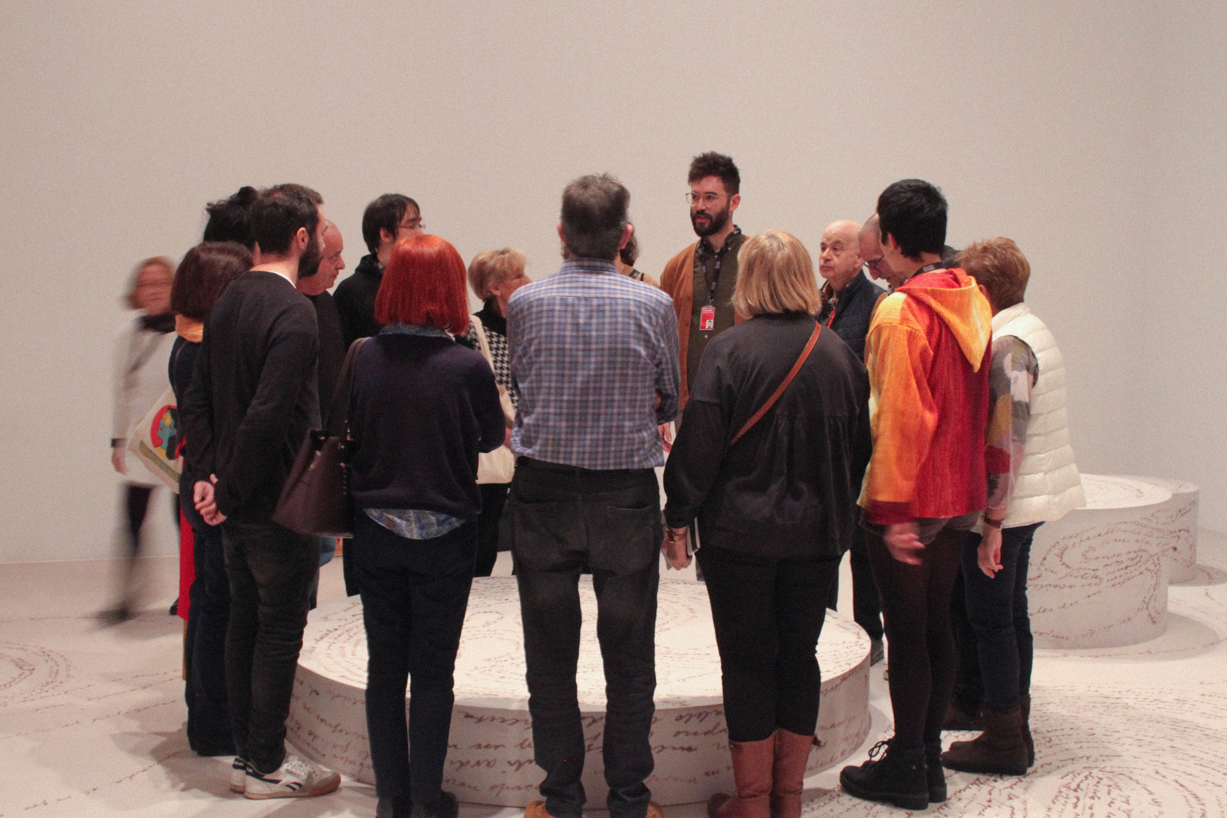 Sesión 7 (12 febrero, 2020): Activada por Christian Fernández Mirón. La sesión comenzó en la sala que albergaba la Orografía poética de Ignacio Gómez de Liaño donde se realizaron diferentes activaciones grupales de la pieza. A partir de ahí recorrimos diferentes salas de la Colección del Museo que dieron lugar a conversaciones e interpretaciones de piezas, entre otras de Eulàlia Grau o Fluxus, donde concluyó la sesión con la interpretación del 4’33» de John Cage.