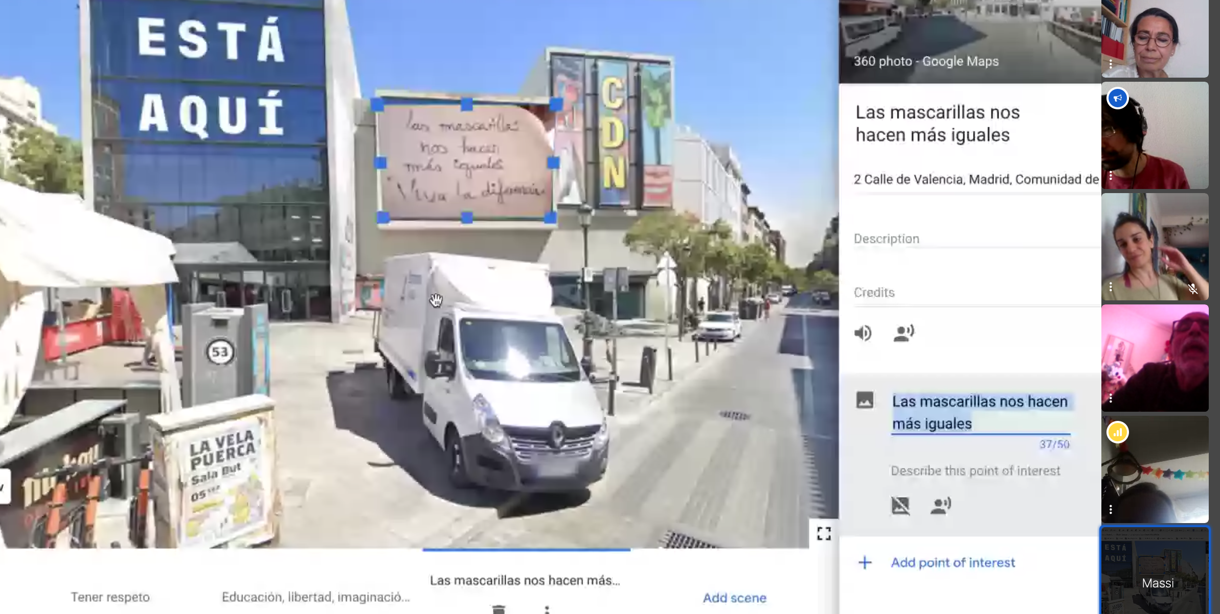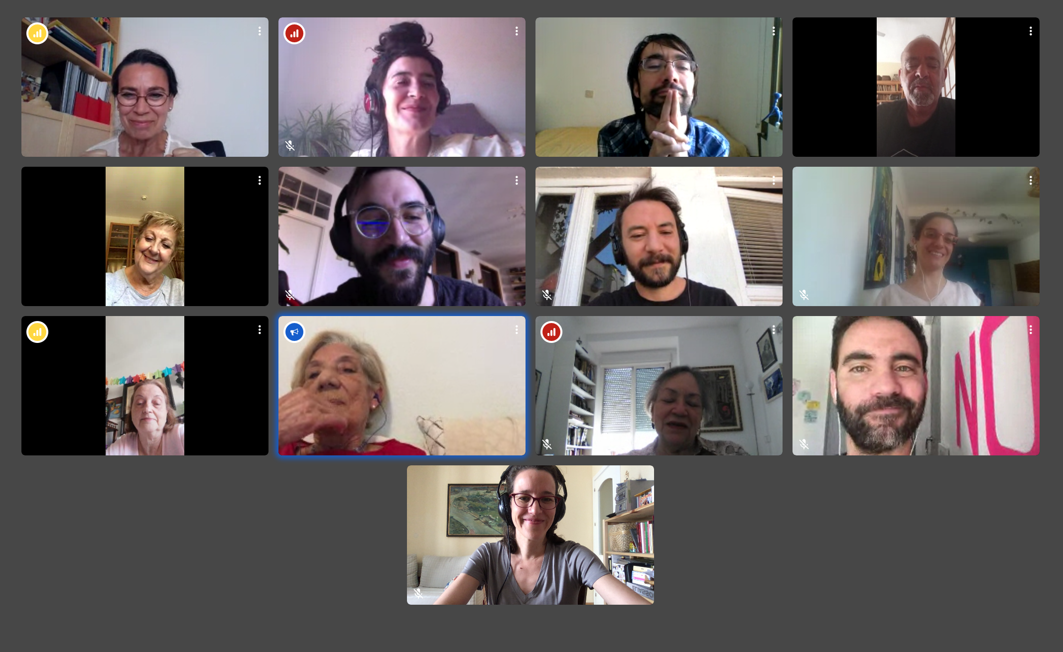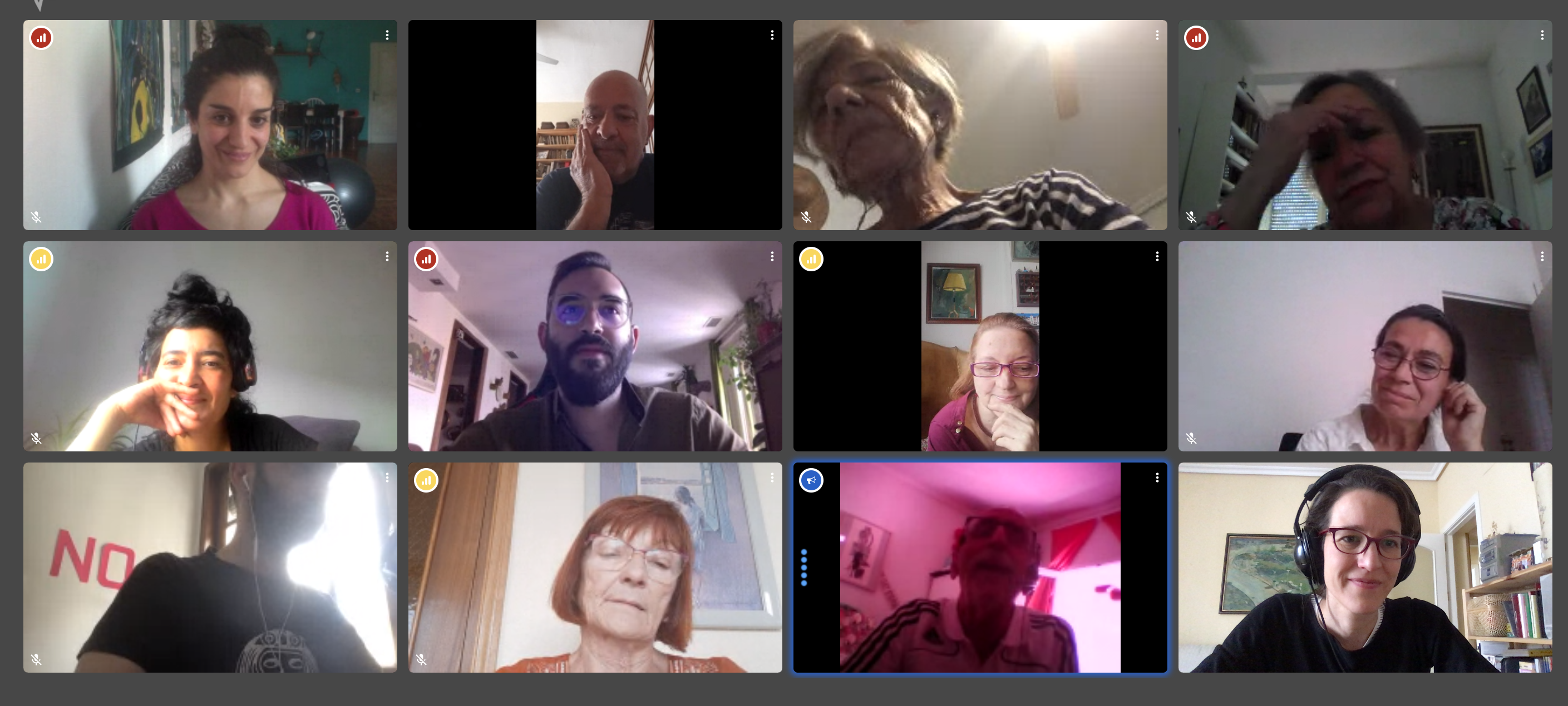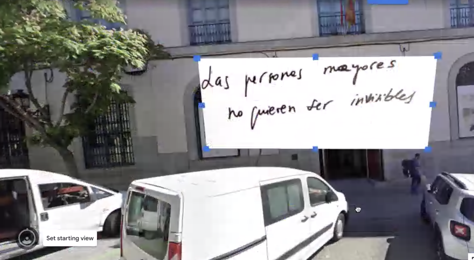 Sesión 13 (11 junio, 2020): Activada por Grupal Crew Collective. Sobre el malestar del colectivo de mayores durante la pandemia. Vulnerables y muy poco escuchados. Problematizando la imagen proyectada hacia el espacio público de las personas mayores que suele estar o bien idealizada (mayores activos, deportistas, vitales…) o bien supeditada a los otros (cuidadorxs, abuelxs, etc.). ¿Qué quieren decir ellas, ellos, independientemente de cómo les muestren hacia afuera? Partiendo de ahí y siguiendo la clave de irrupción, de intervención activista y también lúdica en el espacio público con la que trabaja Grupal, para esta sesión Massi y Rubén volvieron a recurrir a una herramienta virtual, en este caso una herramienta para crear tours virtuales con la que mediaron toda la la sesión en la que pedirían a las participantes escribir sus propios grafitis en el entorno del barrio de Lavapiés. Antes y a modo preparatorio Grupal introdujo el trabajo del colectivo colombiano Mujeres Creando de las que mostraron algunas imágenes y leyeron un fragmento de una de sus fundadoras, María Galindo. Contextualizaron todo esto en el marco del arte contemporáneo e invitaron a la Sra. V -que permanecería en el anonimato- para que nos contara algunas intervenciones en la calle en el marco de las revueltas feministas del 8M. La conexión falló bastante en este punto si bien su aparición resultó enigmática e introdujo nuevos términos en la conversación. ¿Vandalismo, compromiso? La conversación se presentó muy animada en este punto, había posturas opuestas muy bien planteadas y muy interesantes en su confrontación. A partir de ahí comenzó la dinámica central de la sesión, la creación del grafiti. Cada persona del grupo escribió en un papel algo que quisiera que se leyera en el espacio público de su barrio, después por turnos se fueron enseñando las pintadas a la cámara al tiempo que se explicaba el porqué de estas y el lugar elegido para colocarlas. En tiempo real Grupal iba buscando a través de la aplicación conectada a Google Maps el espacio elegido y subiendo la imagen del escrito donde indicara el o la participante. Posteriormente les pedimos un audio explicativo del grafiti. Así explica Grupal lo que sucedió con las pintadas: Los mensajes eran bastante más profundos que aquellos graffitis simplemente ingeniosos que podemos encontrar a la vuelta de la esquina, hablaban de solidaridad (Eduardo), de evitar la invisibilidad y la marginación de las personas mayores (Julia y María José), de la necesidad de apreciar la diversidad (Carlos).