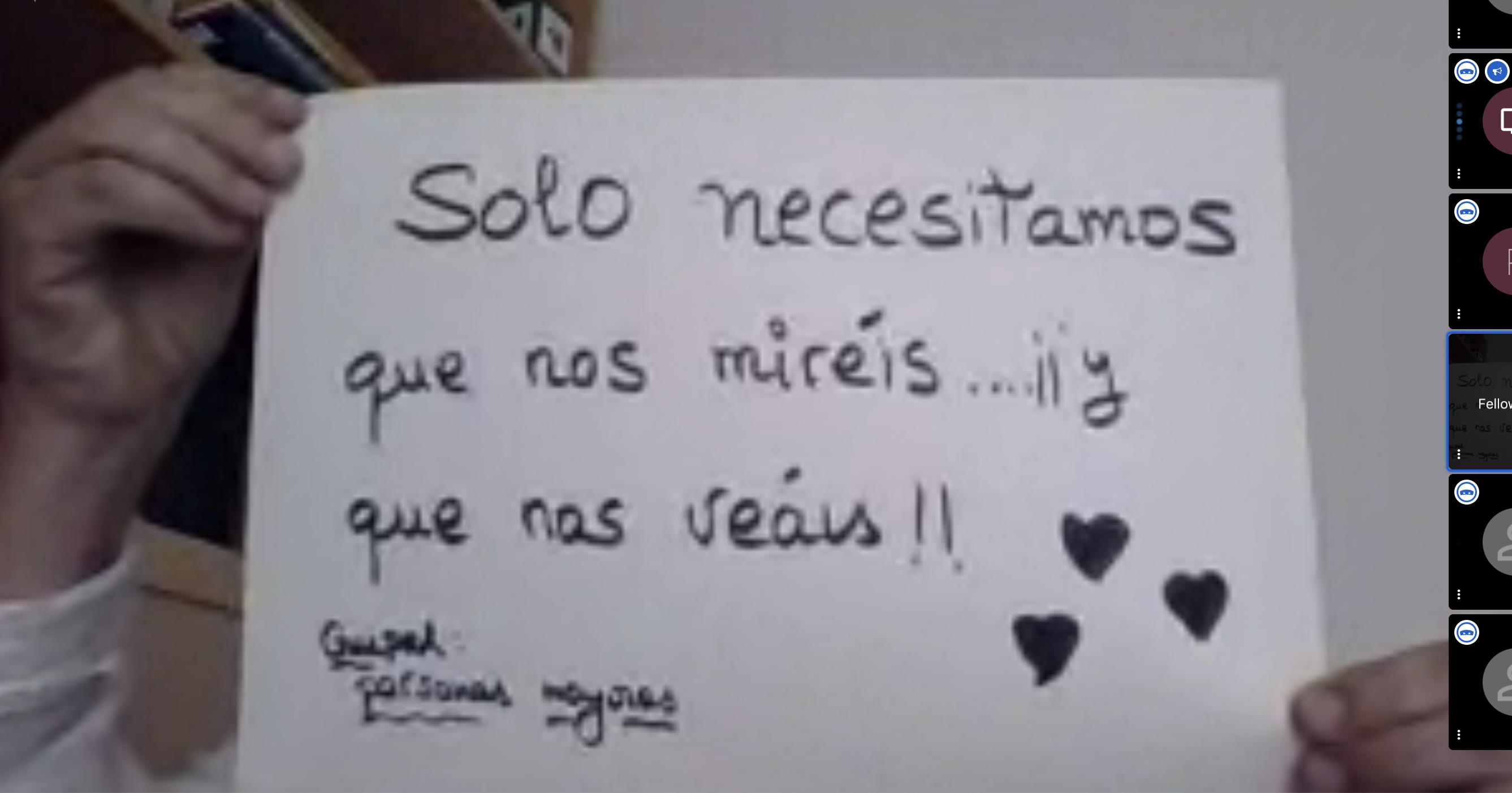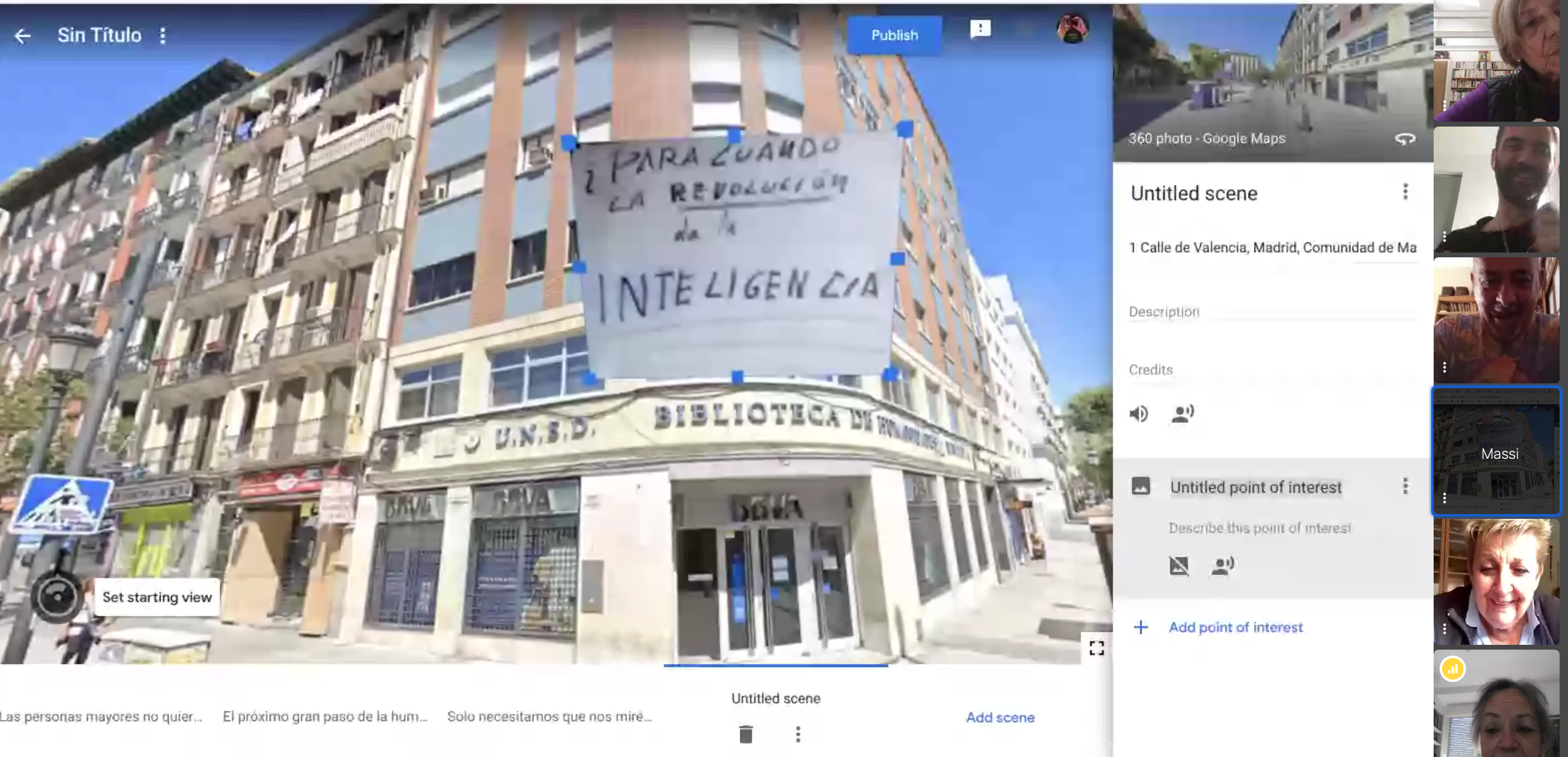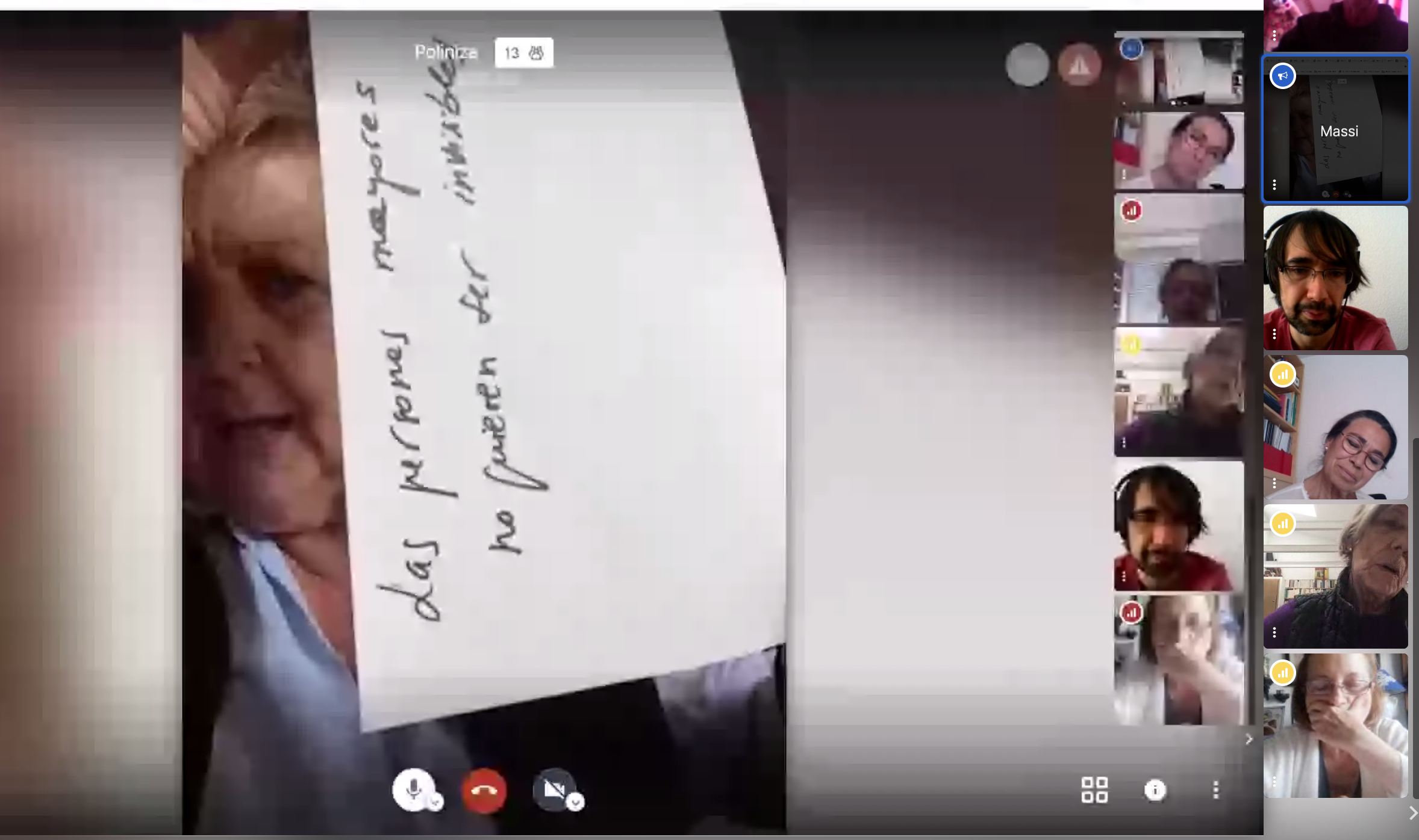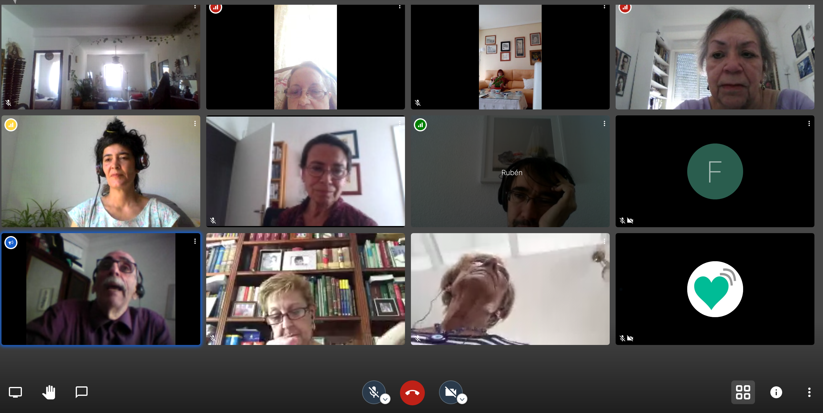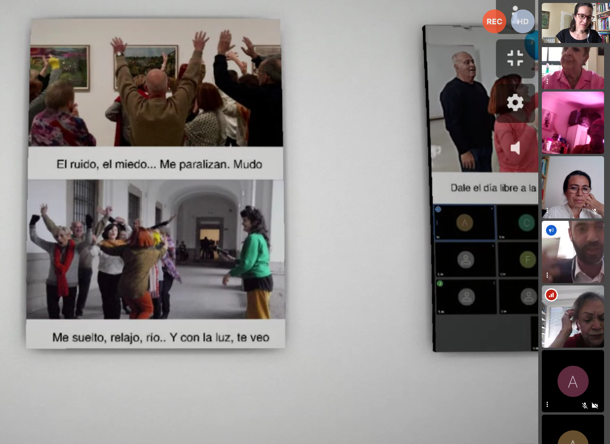 Sesión 13 (11 junio, 2020): Activada por Grupal Crew Collective. Sobre el malestar del colectivo de mayores durante la pandemia. Vulnerables y muy poco escuchados. Problematizando la imagen proyectada hacia el espacio público de las personas mayores que suele estar o bien idealizada (mayores activos, deportistas, vitales…) o bien supeditada a los otros (cuidadorxs, abuelxs, etc.). ¿Qué quieren decir ellas, ellos, independientemente de cómo les muestren hacia afuera? Partiendo de ahí y siguiendo la clave de irrupción, de intervención activista y también lúdica en el espacio público con la que trabaja Grupal, para esta sesión Massi y Rubén volvieron a recurrir a una herramienta virtual, en este caso una herramienta para crear tours virtuales con la que mediaron toda la la sesión en la que pedirían a las participantes escribir sus propios grafitis en el entorno del barrio de Lavapiés. Antes y a modo preparatorio Grupal introdujo el trabajo del colectivo colombiano Mujeres Creando de las que mostraron algunas imágenes y leyeron un fragmento de una de sus fundadoras, María Galindo. Contextualizaron todo esto en el marco del arte contemporáneo e invitaron a la Sra. V -que permanecería en el anonimato- para que nos contara algunas intervenciones en la calle en el marco de las revueltas feministas del 8M. La conexión falló bastante en este punto si bien su aparición resultó enigmática e introdujo nuevos términos en la conversación. ¿Vandalismo, compromiso? La conversación se presentó muy animada en este punto, había posturas opuestas muy bien planteadas y muy interesantes en su confrontación. A partir de ahí comenzó la dinámica central de la sesión, la creación del grafiti. Cada persona del grupo escribió en un papel algo que quisiera que se leyera en el espacio público de su barrio, después por turnos se fueron enseñando las pintadas a la cámara al tiempo que se explicaba el porqué de estas y el lugar elegido para colocarlas. En tiempo real Grupal iba buscando a través de la aplicación conectada a Google Maps el espacio elegido y subiendo la imagen del escrito donde indicara el o la participante. Posteriormente les pedimos un audio explicativo del grafiti. Así explica Grupal lo que sucedió con las pintadas: Los mensajes eran bastante más profundos que aquellos graffitis simplemente ingeniosos que podemos encontrar a la vuelta de la esquina, hablaban de solidaridad (Eduardo), de evitar la invisibilidad y la marginación de las personas mayores (Julia y María José), de la necesidad de apreciar la diversidad (Carlos).