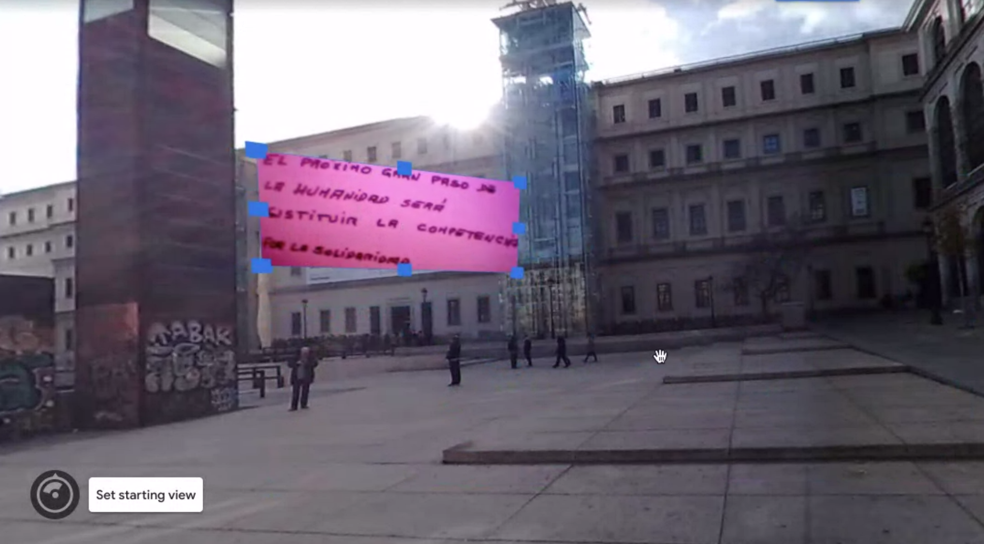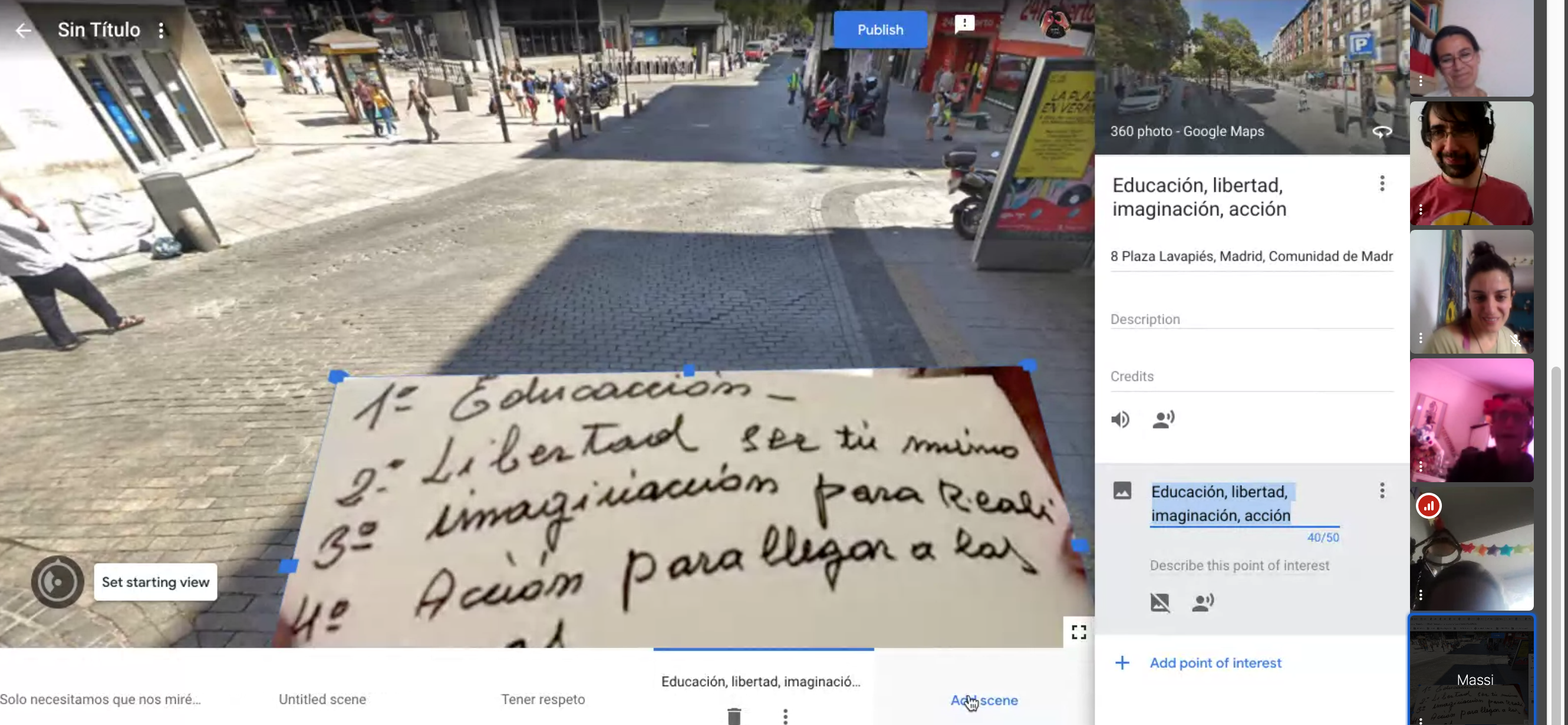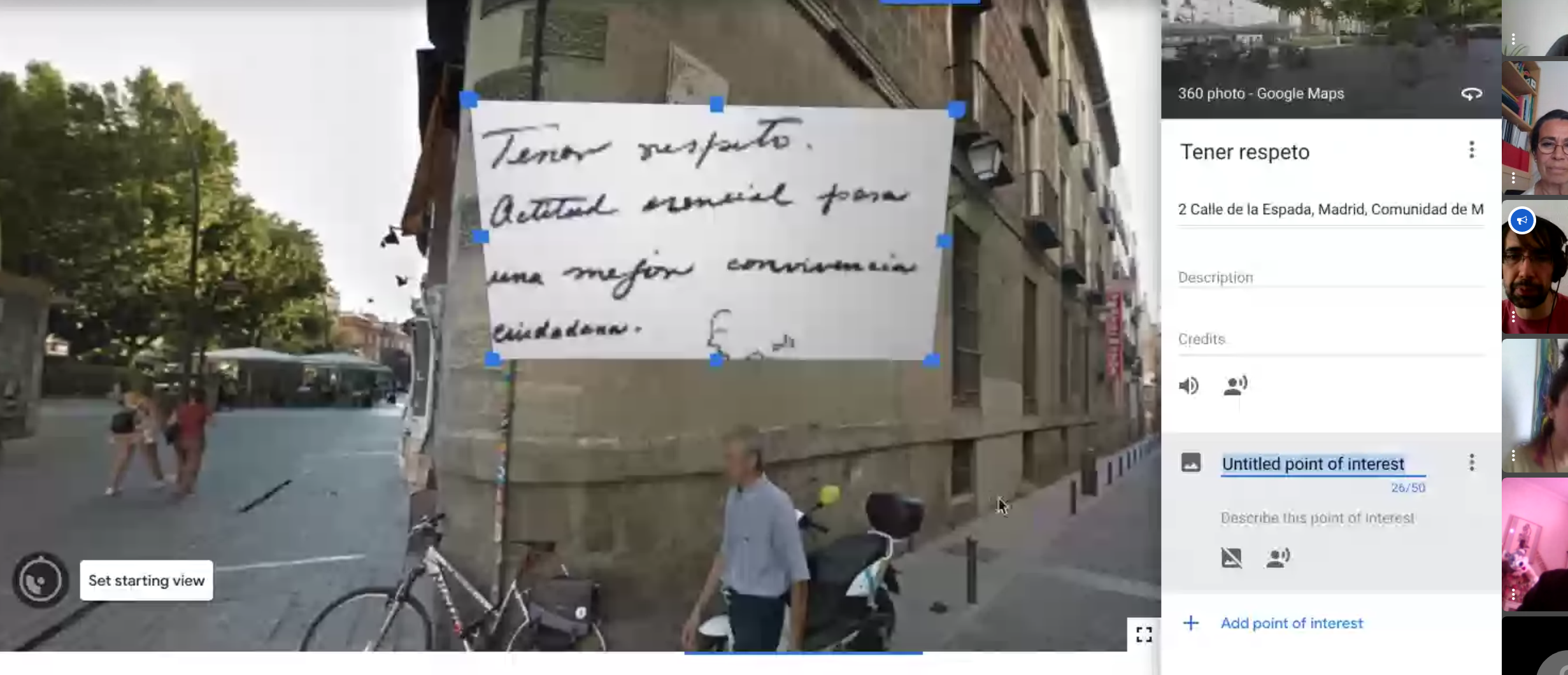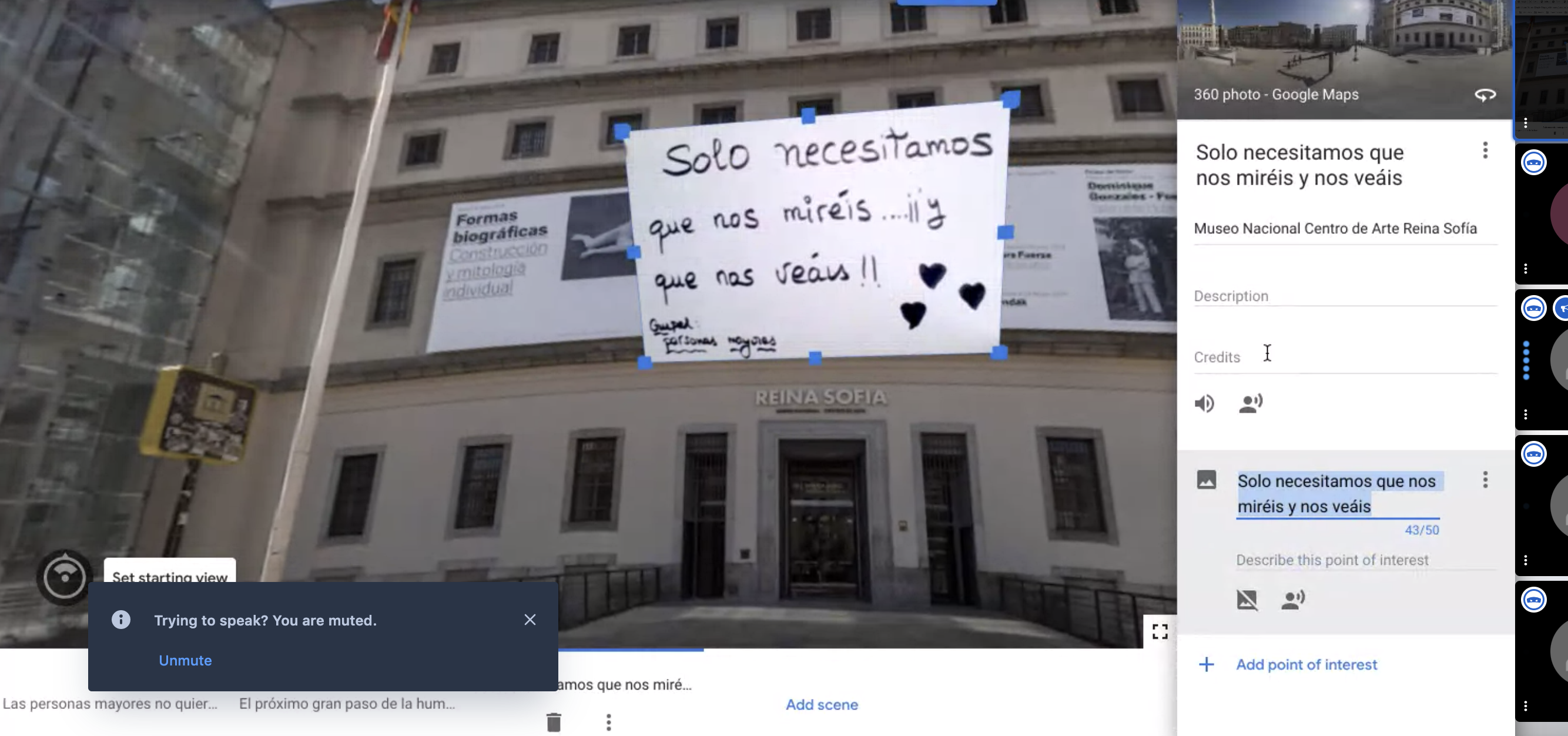 Sesión 13 (11 junio, 2020): Activada por Grupal Crew Collective. Sobre el malestar del colectivo de mayores durante la pandemia. Vulnerables y muy poco escuchados. Problematizando la imagen proyectada hacia el espacio público de las personas mayores que suele estar o bien idealizada (mayores activos, deportistas, vitales…) o bien supeditada a los otros (cuidadorxs, abuelxs, etc.). ¿Qué quieren decir ellas, ellos, independientemente de cómo les muestren hacia afuera? Partiendo de ahí y siguiendo la clave de irrupción, de intervención activista y también lúdica en el espacio público con la que trabaja Grupal, para esta sesión Massi y Rubén volvieron a recurrir a una herramienta virtual, en este caso una herramienta para crear tours virtuales con la que mediaron toda la la sesión en la que pedirían a las participantes escribir sus propios grafitis en el entorno del barrio de Lavapiés. Antes y a modo preparatorio Grupal introdujo el trabajo del colectivo colombiano Mujeres Creando de las que mostraron algunas imágenes y leyeron un fragmento de una de sus fundadoras, María Galindo. Contextualizaron todo esto en el marco del arte contemporáneo e invitaron a la Sra. V -que permanecería en el anonimato- para que nos contara algunas intervenciones en la calle en el marco de las revueltas feministas del 8M. La conexión falló bastante en este punto si bien su aparición resultó enigmática e introdujo nuevos términos en la conversación. ¿Vandalismo, compromiso? La conversación se presentó muy animada en este punto, había posturas opuestas muy bien planteadas y muy interesantes en su confrontación. A partir de ahí comenzó la dinámica central de la sesión, la creación del grafiti. Cada persona del grupo escribió en un papel algo que quisiera que se leyera en el espacio público de su barrio, después por turnos se fueron enseñando las pintadas a la cámara al tiempo que se explicaba el porqué de estas y el lugar elegido para colocarlas. En tiempo real Grupal iba buscando a través de la aplicación conectada a Google Maps el espacio elegido y subiendo la imagen del escrito donde indicara el o la participante. Posteriormente les pedimos un audio explicativo del grafiti. Así explica Grupal lo que sucedió con las pintadas: Los mensajes eran bastante más profundos que aquellos graffitis simplemente ingeniosos que podemos encontrar a la vuelta de la esquina, hablaban de solidaridad (Eduardo), de evitar la invisibilidad y la marginación de las personas mayores (Julia y María José), de la necesidad de apreciar la diversidad (Carlos).