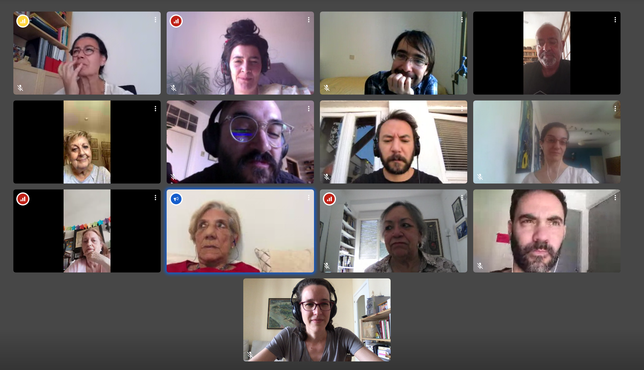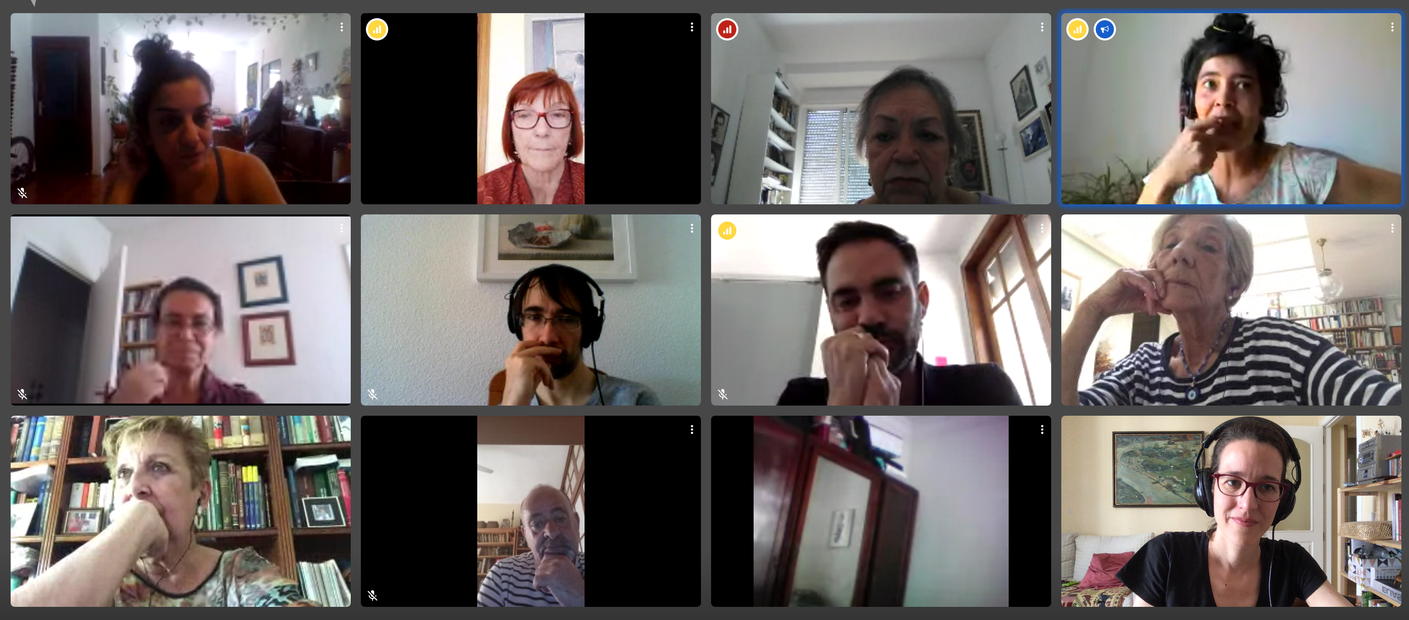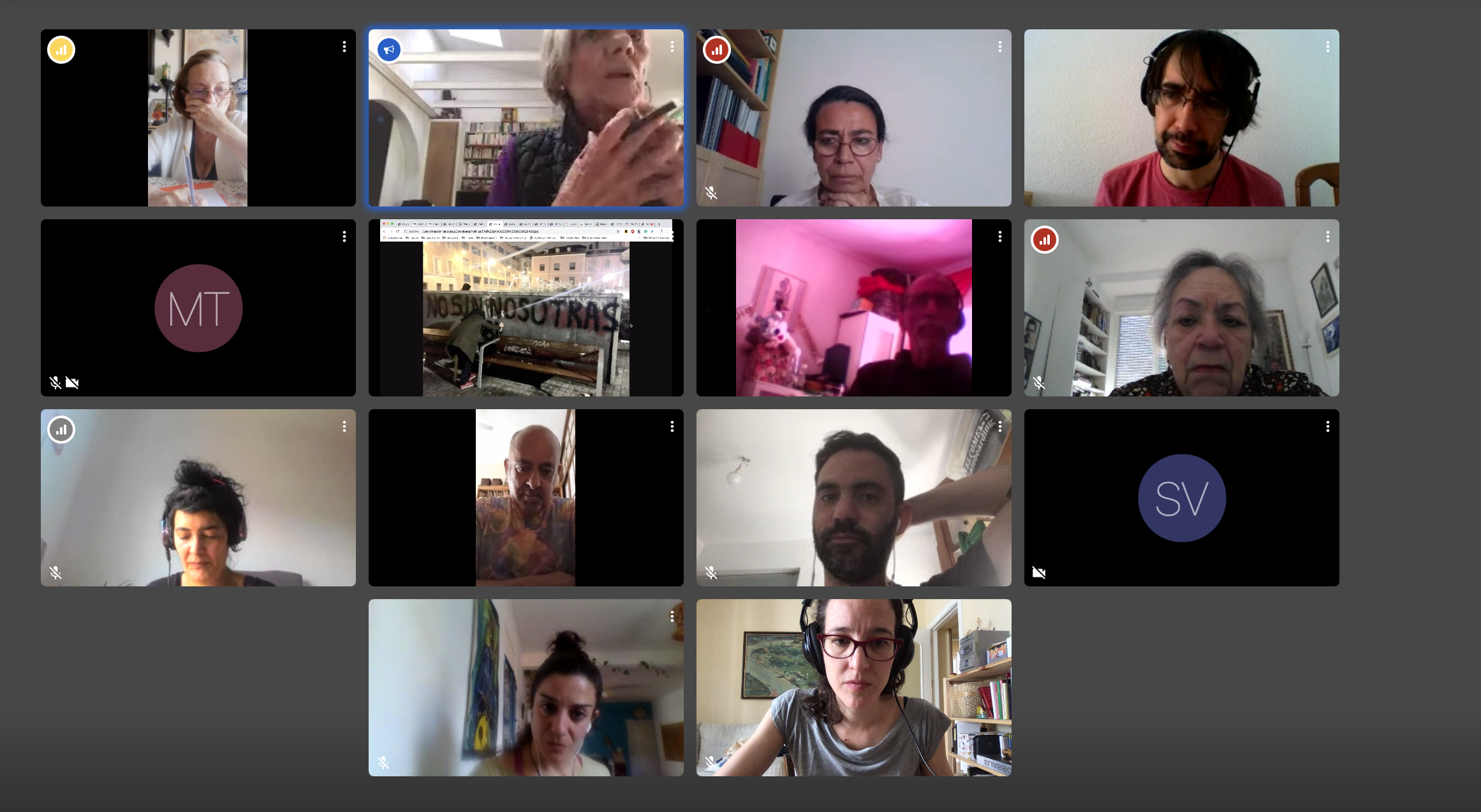 Sesión 10 (21 mayo, 2020): Activada por Fátima Cué. Propuso una dinámica de cuadros vivientes en dos tiempos/grupos que se movieron entre ejecutar y observar-comentar. Partíamos de una visualización de la pantalla en retícula donde podíamos observar todas las ventanas de cada una de las personas participantes. Por un lado el grupo ejecutante había de actuar en la cotidianidad de su hogar. Hacer delante de la pantalla, silenciada, actividades cotidianas (hubo quienes regaron las plantas, se sentaron a leer, pusieron la tele, etc.). A partir de las observaciones de esos “cuadros vivientes” las participantes que estaban en el rol de observadoras eran interpeladas para comenzar a hablar, por turnos, siguiendo unas pautas que pasaban por iniciar la narración describiendo lo que estaba aconteciendo en una de las pantallas para saltar después, en algún punto indeterminado que cada elegía libremente, a una narración personal dejando volar la mente, la palabra, hacia las sensaciones personales. La propuesta permitía saltar del relato personal a la descripción, moverse por la descripción de las diferentes pantallas, “pescar” cosas a partir de las que relatar. Todo ello planteado como una propuesta muy situada en el confinamiento con la voluntad de saltar hacia otros lugares. Una participante comenzó describiendo lo que veía en una de las ventanas de la videoconferencia, alguien estaba leyendo sentada en un sillón. La persona que narraba describió esa escena hasta que saltó a hablar de sali por esa ventana, salir a la calle, sentirse fuera, querer ir a su lugar de vacaciones habitual, el cansancio… Los dos grupos realizaron ambas acciones, la de activar ante la pantalla y la de observar y narrar.