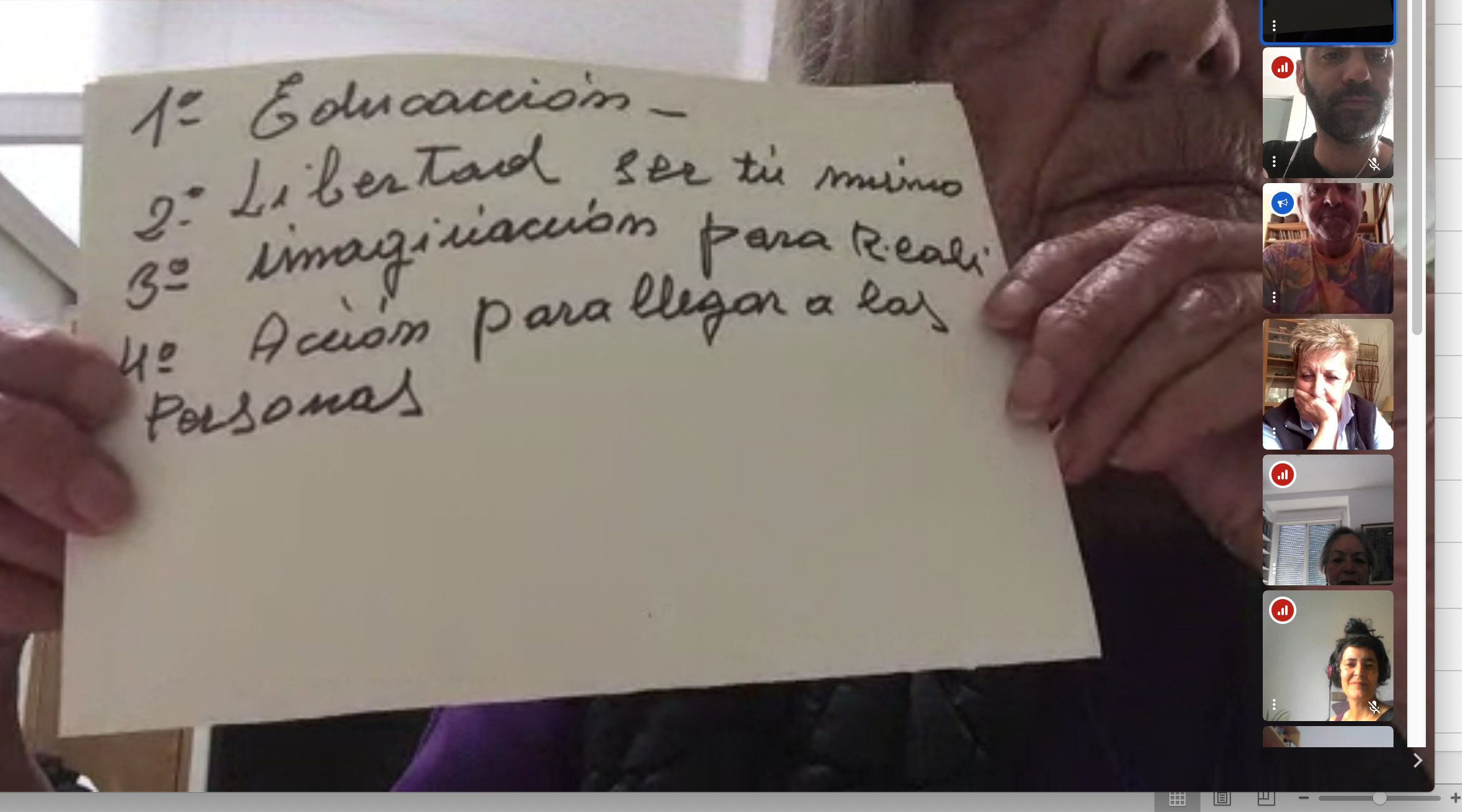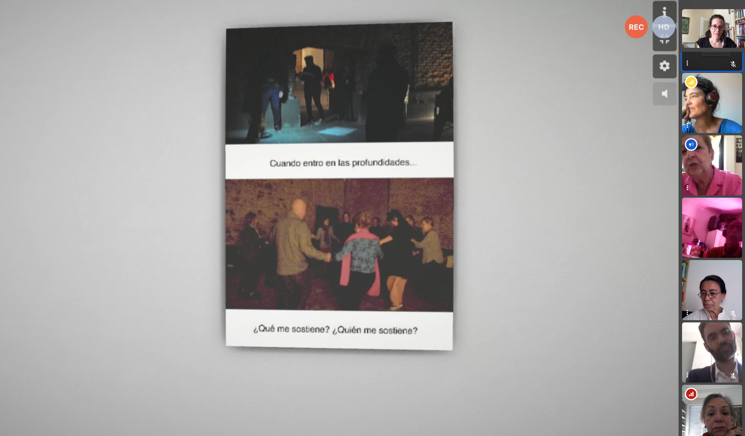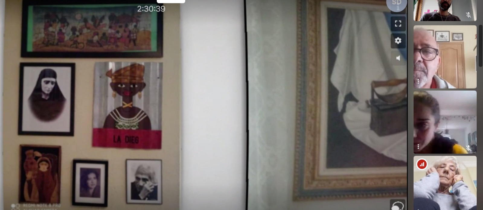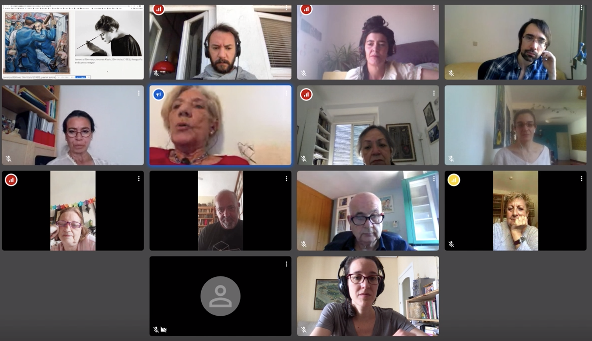Sesión 10 (21 mayo, 2020): Activada por Fátima Cué. Propuso una dinámica de cuadros vivientes en dos tiempos/grupos que se movieron entre ejecutar y observar-comentar. Partíamos de una visualización de la pantalla en retícula donde podíamos observar todas las ventanas de cada una de las personas participantes. Por un lado el grupo ejecutante había de actuar en la cotidianidad de su hogar. Hacer delante de la pantalla, silenciada, actividades cotidianas (hubo quienes regaron las plantas, se sentaron a leer, pusieron la tele, etc.). A partir de las observaciones de esos “cuadros vivientes” las participantes que estaban en el rol de observadoras eran interpeladas para comenzar a hablar, por turnos, siguiendo unas pautas que pasaban por iniciar la narración describiendo lo que estaba aconteciendo en una de las pantallas para saltar después, en algún punto indeterminado que cada elegía libremente, a una narración personal dejando volar la mente, la palabra, hacia las sensaciones personales. La propuesta permitía saltar del relato personal a la descripción, moverse por la descripción de las diferentes pantallas, “pescar” cosas a partir de las que relatar. Todo ello planteado como una propuesta muy situada en el confinamiento con la voluntad de saltar hacia otros lugares. Una participante comenzó describiendo lo que veía en una de las ventanas de la videoconferencia, alguien estaba leyendo sentada en un sillón. La persona que narraba describió esa escena hasta que saltó a hablar de sali por esa ventana, salir a la calle, sentirse fuera, querer ir a su lugar de vacaciones habitual, el cansancio… Los dos grupos realizaron ambas acciones, la de activar ante la pantalla y la de observar y narrar.