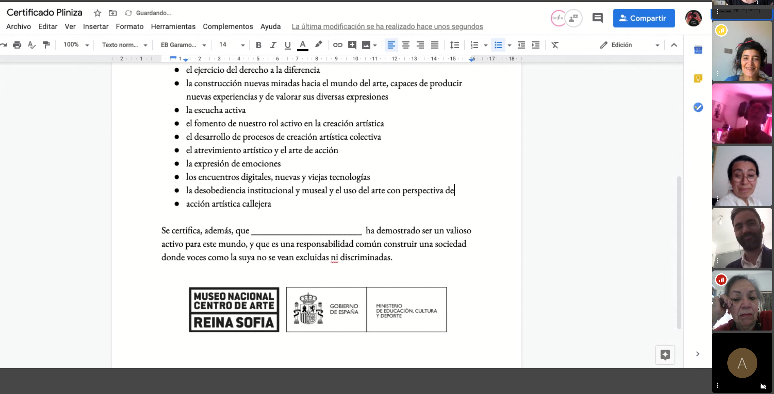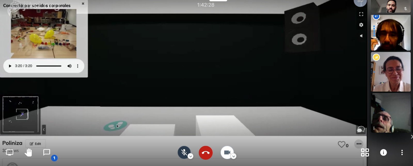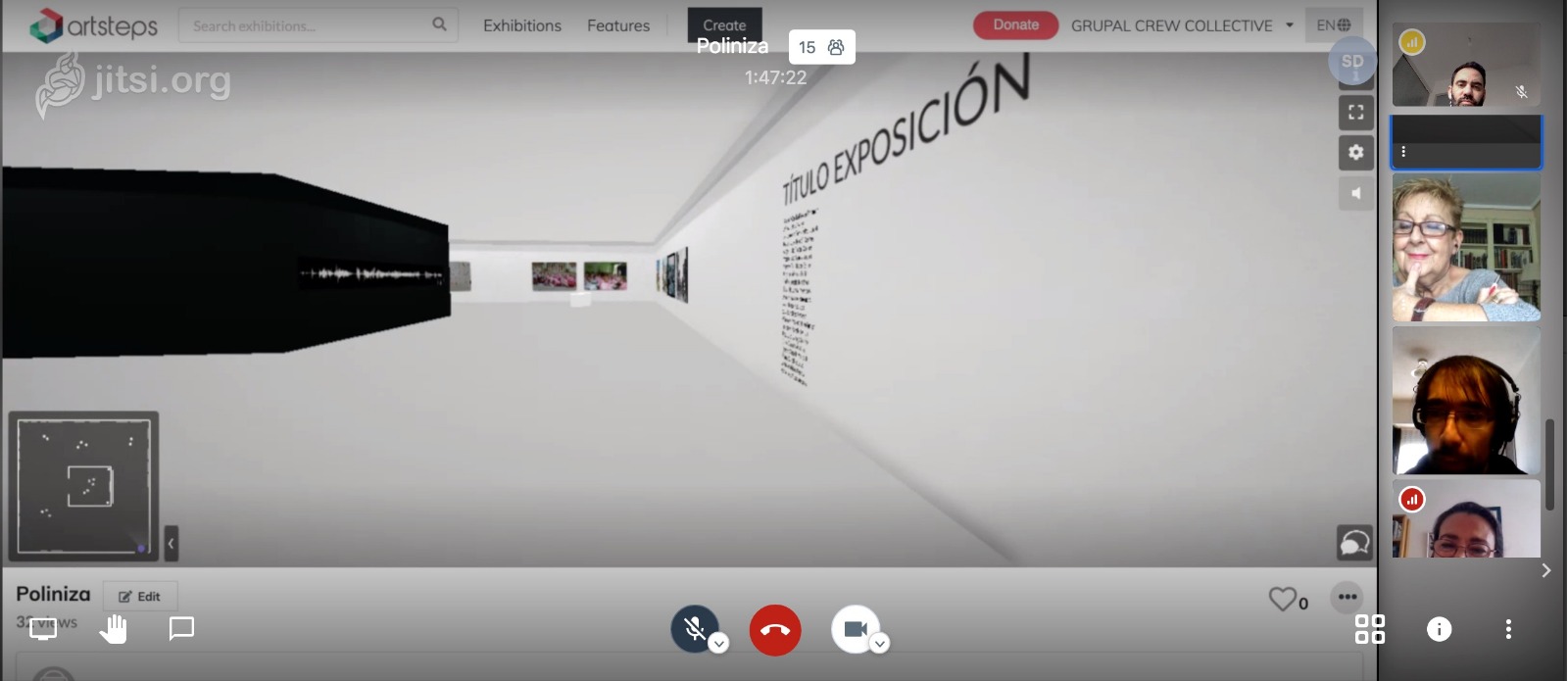 Sesión 14 (18 junio, 2020): Activada por María Andueza, Fátima Cué, Grupal Crew Collective, Christian Fernández Mirón y Colectivo Lisarco. ¿Cómo organizar una última sesión de un proyecto como Poliniza? Un proyecto diverso y arriesgado, un proyecto que se ha ido construyendo sesión a sesión desde su maduración constante. Queríamos celebrar esta última sesión, que no fuera nostálgica pues sentíamos que todas íbamos a echar de menos las sesiones. Decidimos retomar el entorno virtual de la exposición que creamos con Grupal a la que nos faltaba darle un título. De este modo articulamos la sesión moviéndonos por el museo, que recorrimos recordando las imágenes que habían compartido y otras muchas que habíamos añadido con objeto de incorporar también a las personas que no pudieron estar presentes en esta segunda fase del proyecto. Añadimos además una sala nueva al museo, con la que dinamizamos la revisión del proyecto de forma conjunta. En esa sala había paneles con dos imágenes y una frase. Cada uno de esos paneles iba dirigido a una persona en concreto y la frase pretendía sugerir un inicio de conversación a partir de los recuerdos de una sesión en concreto. Después de este recorrido desde la memoria y el presente pasamos a pensar el título de la exposición para lo que nos servimos de la pieza de Pauline Oliveros We are together because… a partir de la cual llegamos al título de la exposición “Como raíces estamos juntas”. Para finalizar la sesión y puesto que ya habíamos determinado un reencuentro (confiábamos que fuera presencial) a la vuelta del verano, les dimos la noticia de que en ese encuentro haríamos una entrega de diplomas. Unos diplomas, cuyas competencias conseguidas, las pensamos entre todas como cierre al proyecto. Fue un cierre hermoso, emotivo, divertido, como todo Poliniza.