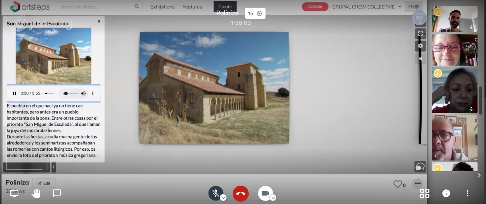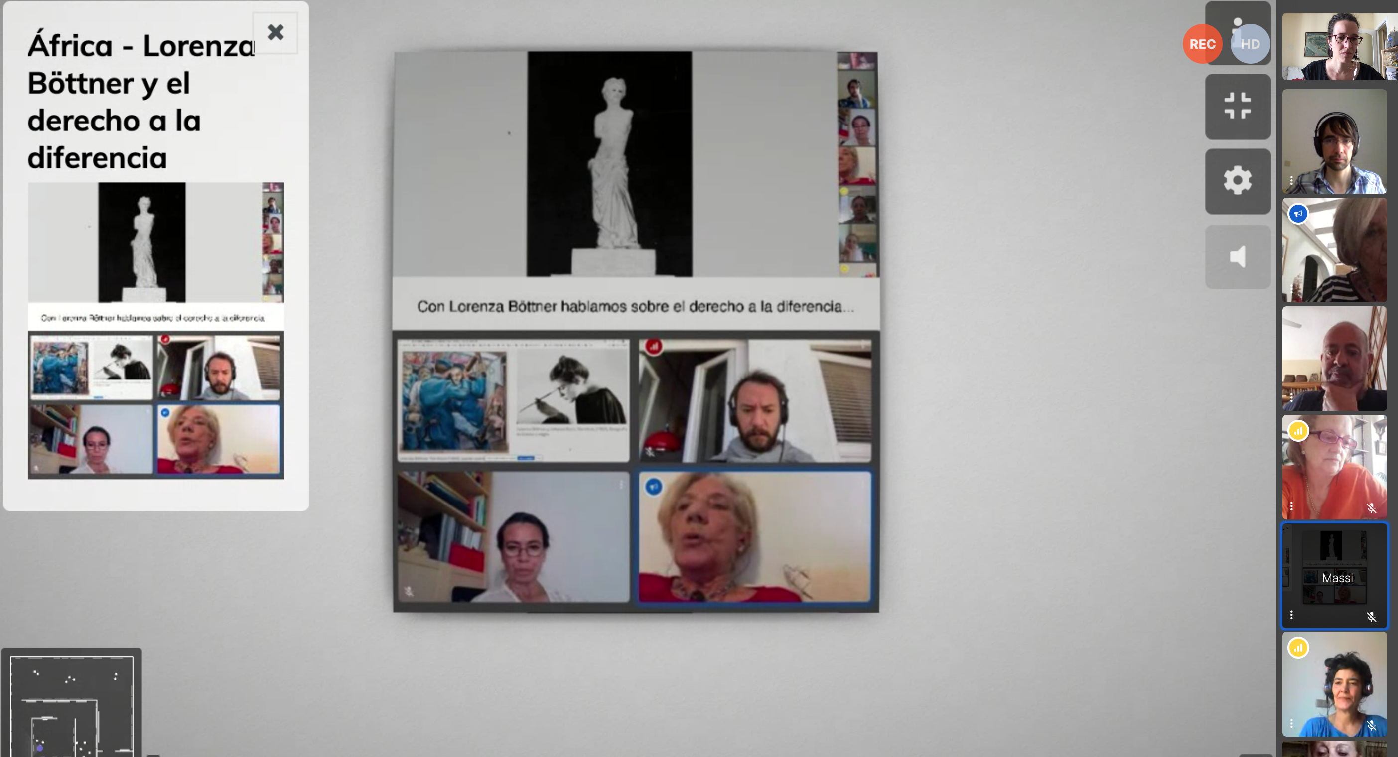 Sesión 9 (14 mayo, 2020): Activada por Grupal Crew Collective. En esta sesión Grupal retomó el trabajo que había planteado para realizar en el museo y que tuvimos que suspender debido a la crisis sanitaria provocada por la Covid-19. La sesión original consistía en una suerte de ejercicio de comisariado en el Museo. Cada participante había seleccionado un documento (imagen o audio) relevante desde el plano personal. Con todos ellos Grupal iba a plantear una sesión en la se insertarían [esos documentos] mediante una proyección eventual en diferentes salas del museo. La idea era hacer un recorrido guiado por las salas donde se proyectarían las imágenes o se escucharían los sonidos y cada participante explicaría su aportación incorporando más adelante todas estas explicaciones en una audioguía que pasaría a formar parte de una visita virtual del museo a través de una plataforma online. De alguna forma se planteaba una irrupción en el museo y en las lógicas de selección, legitimación y exhibición dentro de la institución. Al tener que trasladar la actividad al formato no presencial a través de una plataforma de videollamadas, lo que Grupal propuso en su lugar fue crear una exposición virtual con la plataforma Artsteps. Esta sesión era la primera del confinamiento por lo que buscamos acoger al grupo en este nuevo formato. La sesión estuvio mediada por una visita virtual a esa exposición, repleta entonces de objetos anónimos. Se observó y escuchó cada aportación y se habló de su posible autoría. Especular para después conocer y escuchar a la participante que había detrás de cada una de ellos. De este modo se fue generando una conversación que nos permitía recordarnos y reconocernos como grupo sin dejar a un lado la propuesta de activar un espacio expositivo. Para finalizar la sesión, Grupal había propuesto pensar conjuntamente el título de la exposición, tarea que por una cuestión temporal retomamos en la última sesión del proyecto.