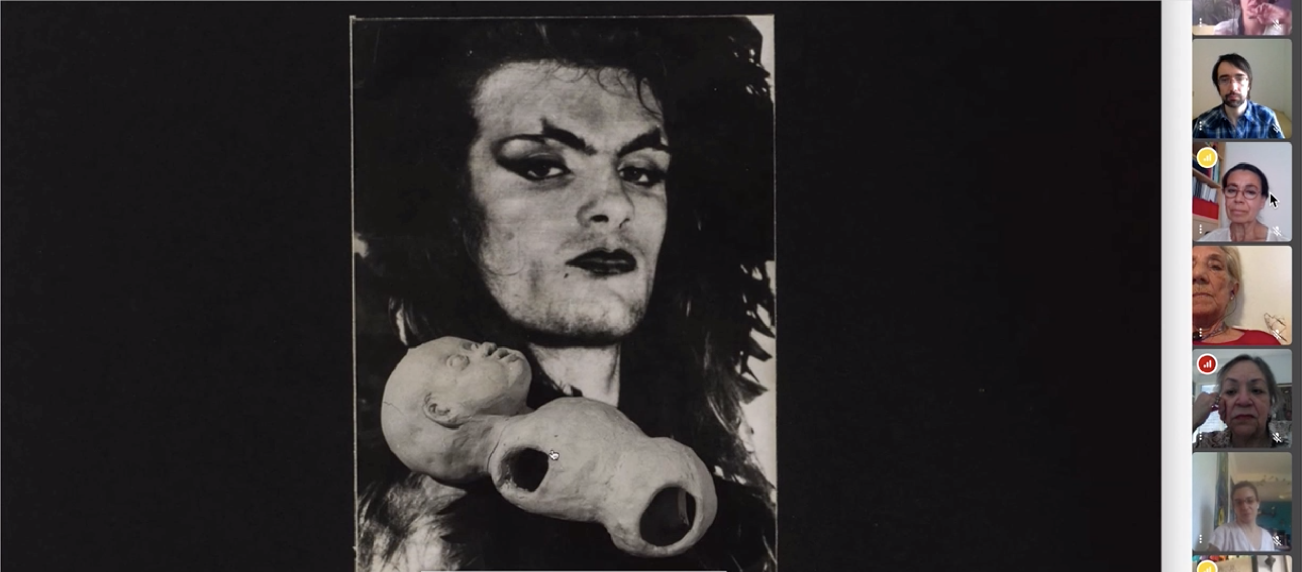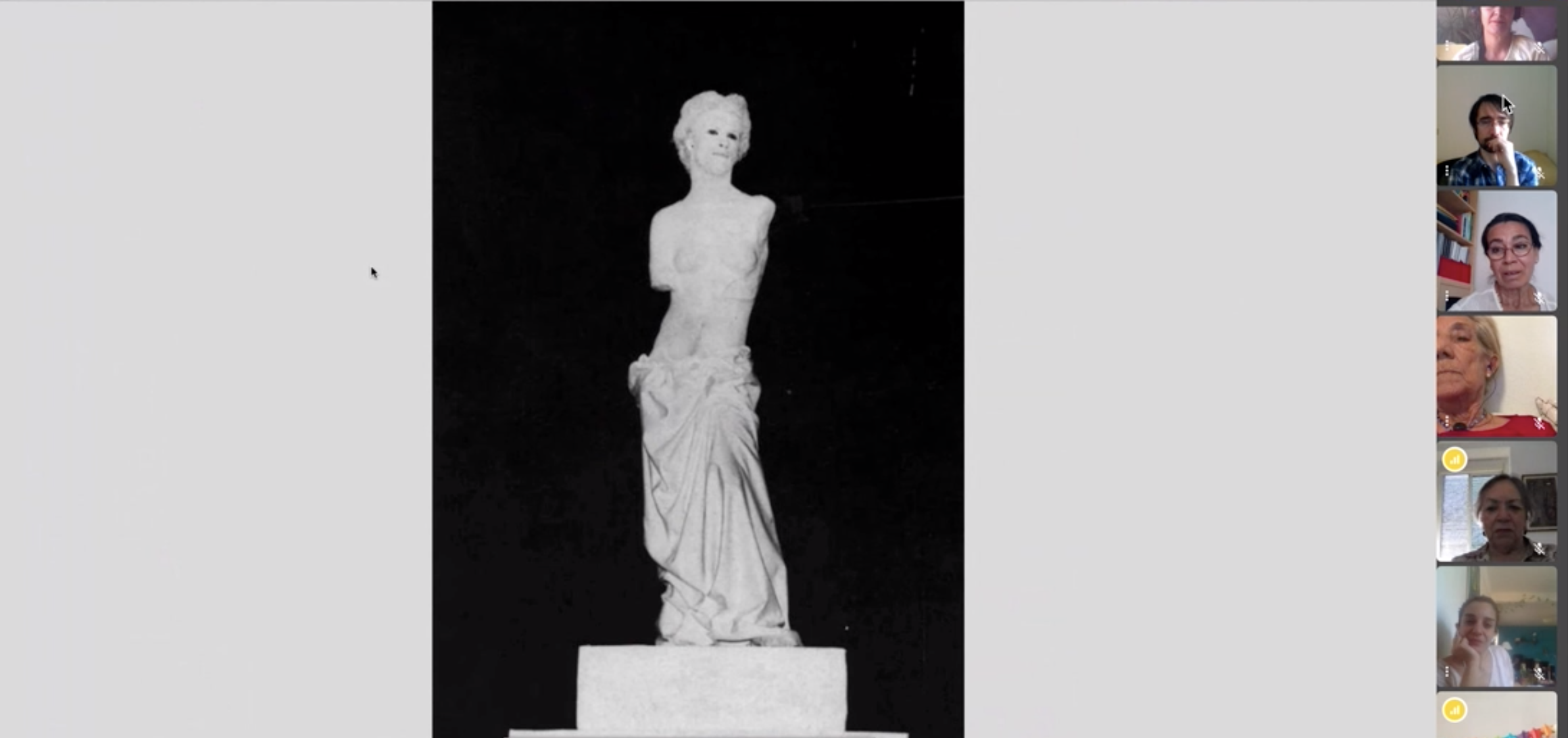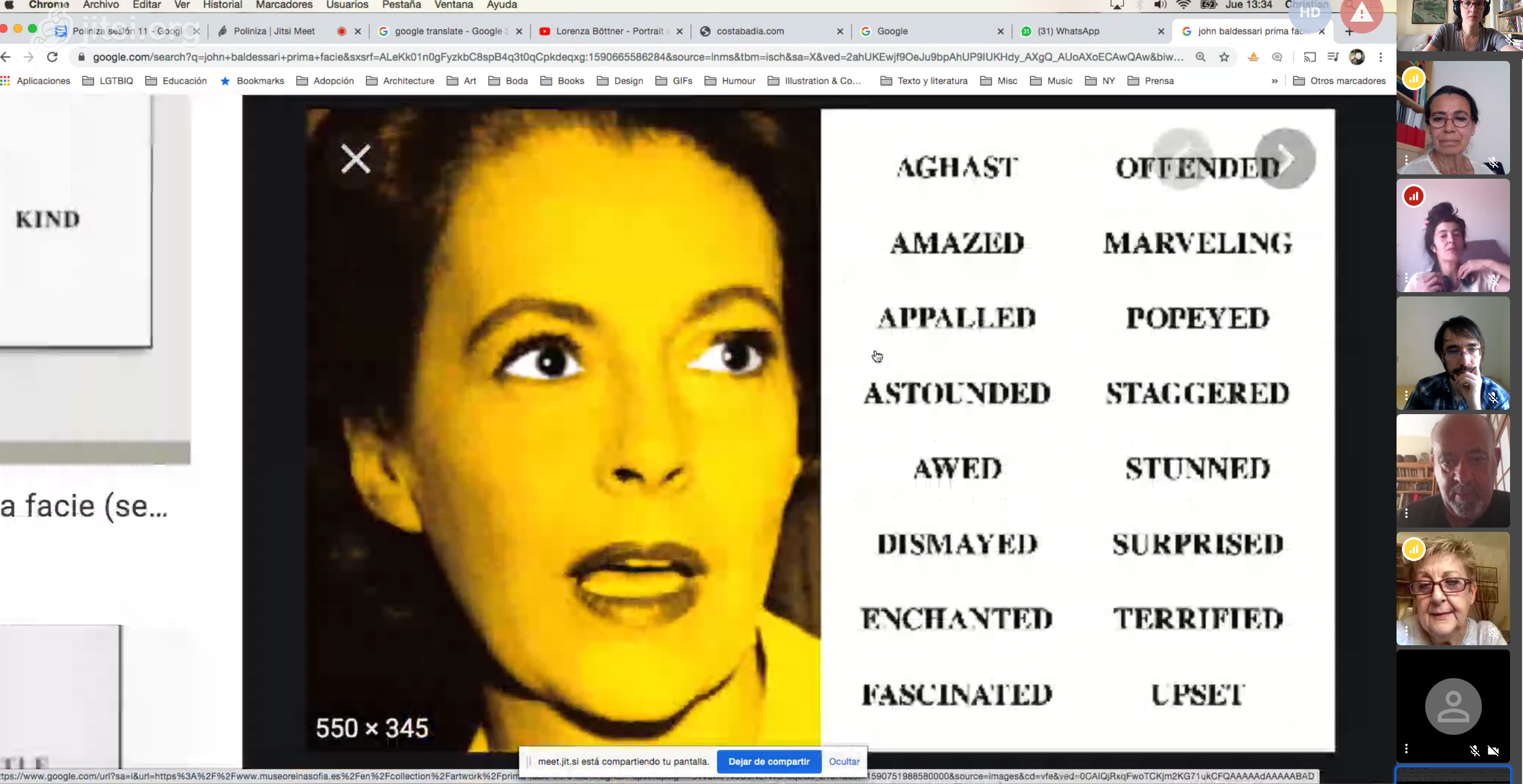 Sesión 11 (28 mayo, 2020): Activada por Christian Fernández Mirón. El derecho a la diferencia. Esta sesión se propuso desde una metodología muy didáctica que incluía como parte del proceso -al tratarse de una sesión online- presenciar la navegación por Internet de Christian buscando contenidos, traduciéndolos y compartiéndolos con las participantes. La sesión partió de los tableau vivant (cuadros vivientes) sobre los que había trabajado la sesión anterior de Fátima. Al hilo de todo aquello introdujo Christian a Olga Desmond para conectarla después con Lorenza Bötter en concreto con la imagen en que aparece transformada en la Venus de Milo. A través de estas imágenes la sesión introducía el arte y la diversidad funcional, incluyendo en la conversación la condición transgénero de Böttner, como también el que fue seropositiva. Se introducían así cuestiones como la interseccionalidad y los vínculos de los que tanto se estaba hablando en la pandemia entre la crisis del SIDA y la de la COVID-19. La conversación dio paso a una pequeña acción conjunta desencadenada por la pieza de John Baldessari Prima facie que forma parte de la colección del Museo Reina Sofía. En ella se ve el rostro de una mujer y a la derecha una serie de términos que la describen desde diferentes ángulos (sorprendida, aterrorizada, ofendida…). La dinámica propuesta, divertida y distendida para cerrar la sesión consistió en, por turnos, cada persona verbalizar un término que el resto había de representar con el rostro. Por ejemplo: “alegría” “disconformidad”, “aburrimiento”, etc. Con la videoconferencia organizada en retícula para poder ver todas las caras discurrió este ejercicio como cierre de una sesión sobre el derecho a la diferencia.