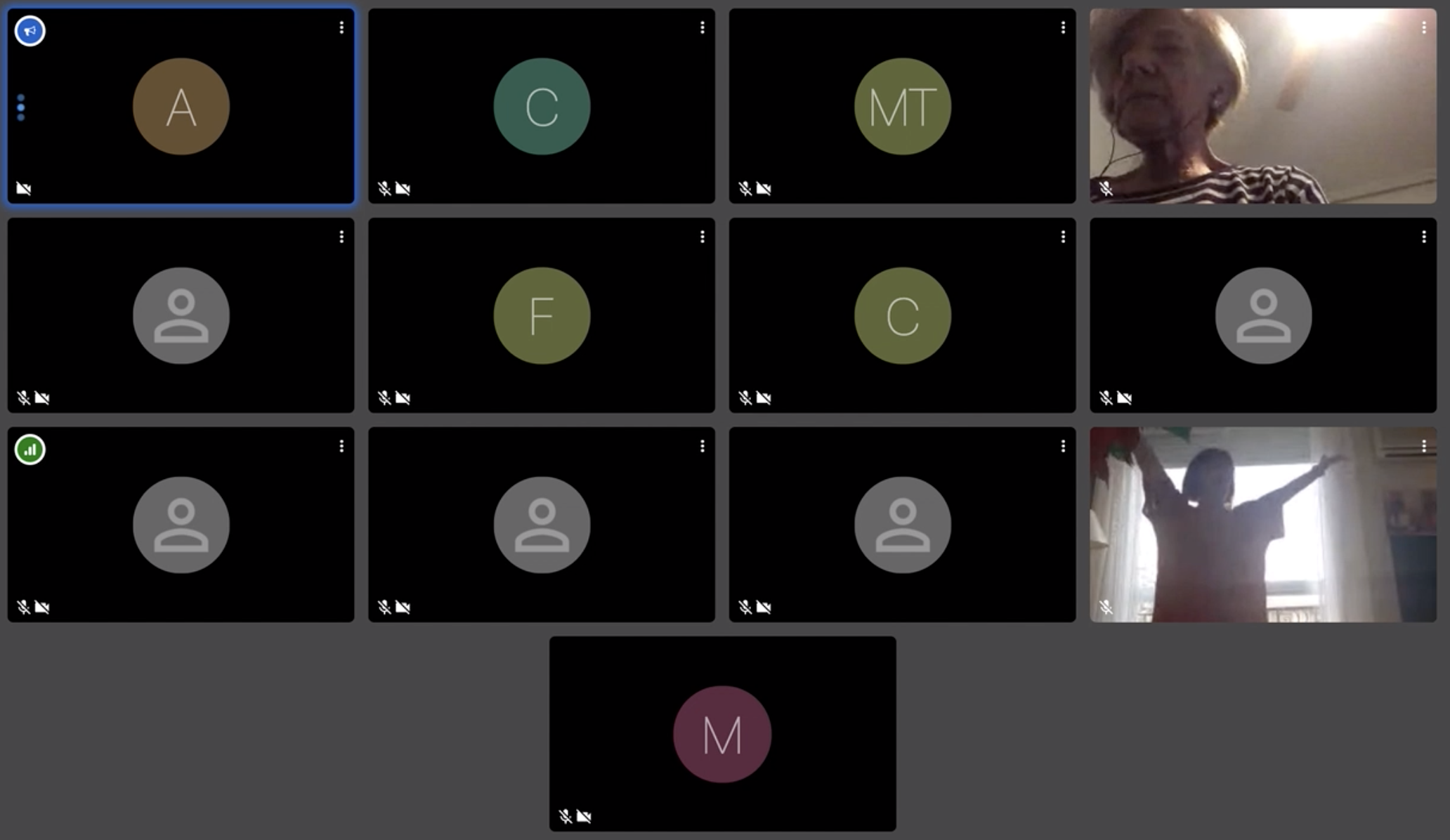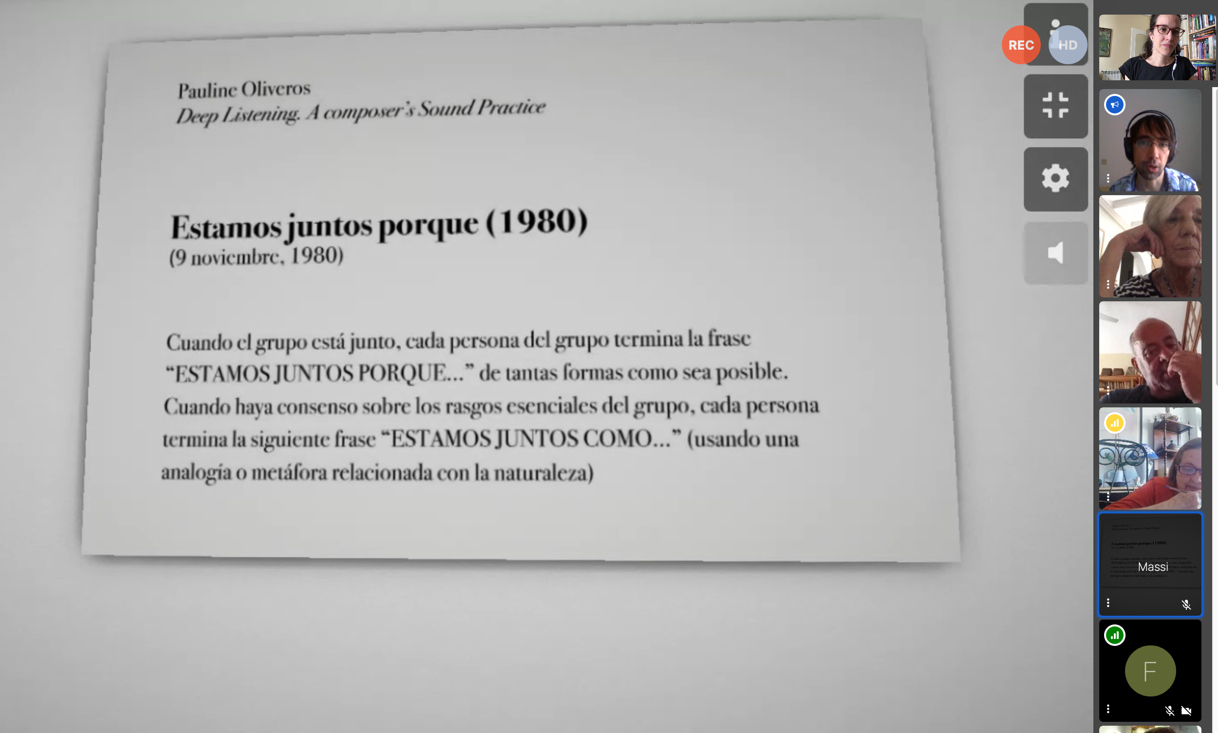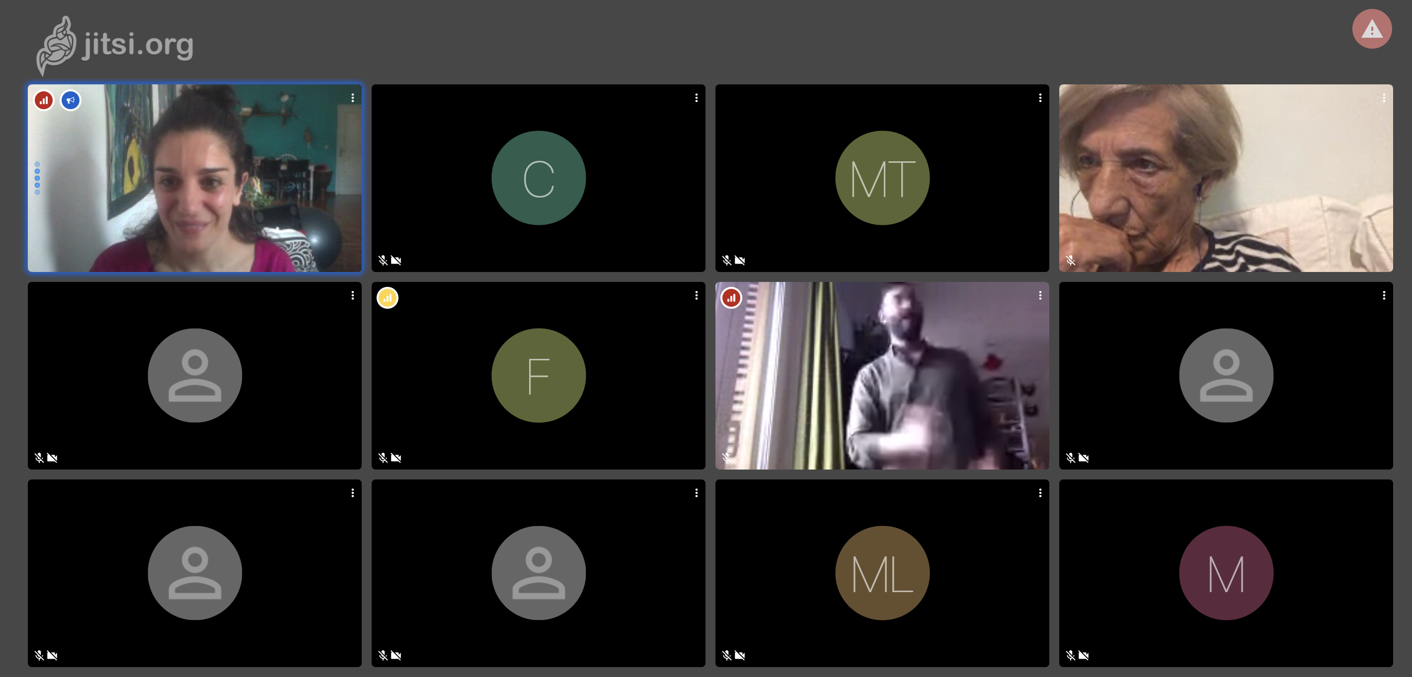 Sesión 12 (4 junio, 2020): Activada por Almudena Rubiato (Colectivo Lisarco) La sesión se organizó en tres tiempos y giró en torno al cuerpo y el espacio de la casa. En esos tres tiempos hubo un primer intervalo de preparación, uno segundo de ejecución y el tercero de reflexión y puesta en común. La sesión comenzó con unos ejercicios de respiración guiados por Almudena, para los que nos pidió que nos tumbáramos en alguna zona cómoda. Los hicimos con la cámara apagada, tan solo permanecía la cámara y el audio de Almudena conectados. Fue un ejercicio de respiración parecido al que realizaron en sus sesiones en el Museo donde a través de la respiración se abrían las ventanas del cuerpo. Una vez concluida esta parte, Almudena les pidió que eligieran un marco de la casa o de la habitación en la que estaban situados con la cámara. Pasaríamos así a la siguiente parte. Con anterioridad a la sesión habíamos pedido a cada miembro del grupo que nos enviaran una canción especial, determinante de su vida o que les gustara especialmente por algo. Con esos materiales la parte central de la sesión discurrió con todas las cámaras y audios de las participantes apagados. De nuevo solo se veía el recuadro de la cámara de Almudena activado. Ella lanzaba las músicas que nos habían enviado. Cuando se escuchaba una música, la persona que la había mandado debía encender su cámara (no el audio) y actuar frente a la pantalla (podían bailar, podían realizar alguna acción, lo que quisieran, lo que les llevara a hacer esas músicas). El resto observaban. Así fueron sonando una a una las músicas de todas las personas presentes en la sesión que concluyó con un tiempo en el que compartimos impresiones sobre lo que había acontecido, el cómo había sucedido y lo que nos había suscitado a cada una.