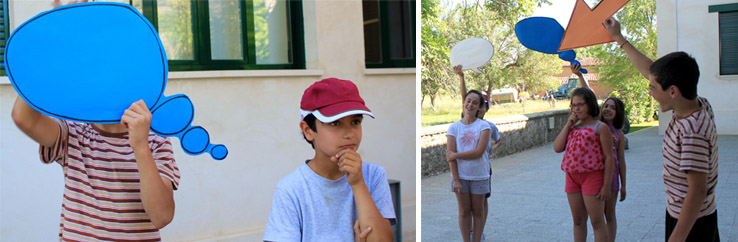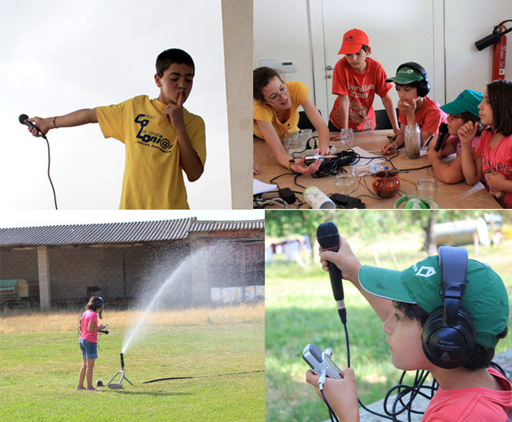 En los cinco días que estuvimos trabajando abordamos actividades en las que el aprendizaje de lo visual y lo sonoro aparecían íntimamente ligados: juegos de percepción sonora, escenografías visuales del sonido, murales sonoros del entorno de Cerezales, creación de dispostivos sonoros para transformar objetos en altavoces y por último construcción de unos altavoces que cada participante se llevó a casa al finalizar el taller.