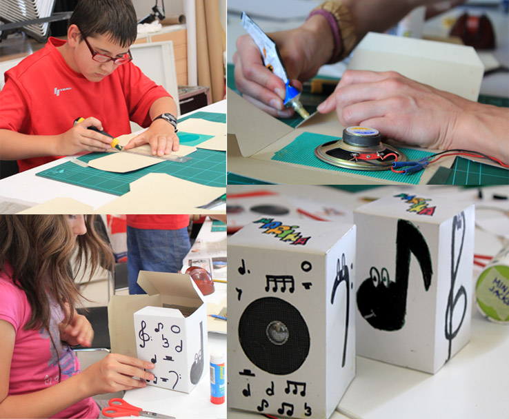 El taller de «Suénalo tú mismo» consistió en una semana de actividades con niños y niñas de entre 8 y 14 años que trabajaron con el sonido desde múltiples vertientes. El taller partía de la experimentación con material sonoro (analógico y digital) para trabajar en torno a la idea de altavoz. Altavoz entendido no solo aparato electroacústico que amplifica el sonido sino también como espacio físico de exploración sonora. El objetivo era que fueran las niñas/os los que construyeran los dispositivos sonoros de forma creativa. Trabajaron con placas a las que sumaron zumbadores con interruptores que incorporaban una ligera interacción, ventiladores que activaban sonidos de tipo analógico y pequeños altavoces de 2W que amplificaban las grabaciones que ellos mismos realizaron y editaron durante el taller.