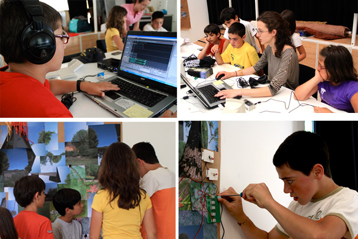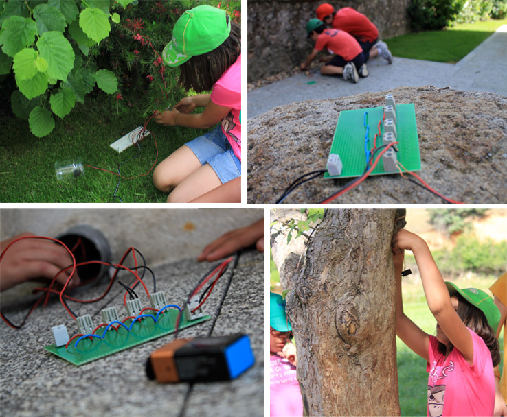 3. Gran expectación y nerviosismo al comenzar a trabajar con cables, placas y zumbadores. Por grupos trabajaron con estos dispositivos que tuvieron que montar y con los que después estuvimos experimentando en el entorno de la Fundación Cerezales. El reto, superado, fue conseguir transformar con el espacio el sonido intenso y constante del zumbador. Desagües, árboles y esculturas hicieron las veces de altavoces improvisados.