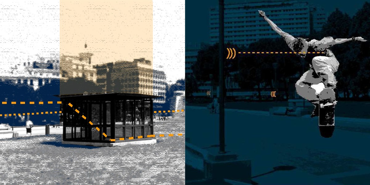 Apropiaciones -lugar fue un proyecto de intervención en el espacio público pensado para aquellos lugares de la ciudad que usan los skaters para realizar sus acrobacias. Esta actividad que está penalizada en según qué lugares, articula sin embargo un contacto muy rico con el entorno urbano. El proyecto proponía por este motivo conectar, mediante una instalación sonora, la presencia de los skaters y los transeúntes con el entorno que los acogía a ambos. Para ello se concibió un espacio que registraría la presencia de los individuos respondiendo con una organización de sonidos que estaría articulada en función de los diferentes parámetros como la velocidad o la afluencia captados por los sensores ubicados a ambos lados del paseo. Además de estos sonidos, que se emitirían desde las farolas que enmarcaban el paseo central de la plaza, se consideraba la idea de emplear las salidas de ventilación del parking subterráneo como cajas de resonancia que marcarían la base sobre la que se organizarían el resto de elementos sonoros de la intervención.